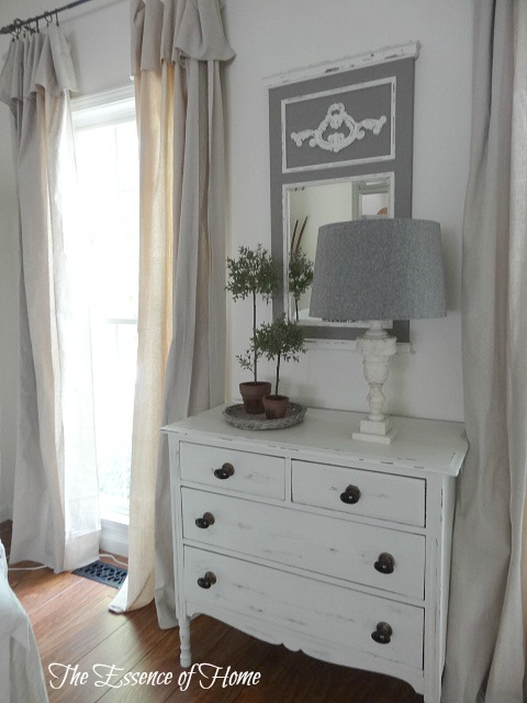 I hung a vintage style mirror in place of the large basket with flowers. The basket of flowers is now on the floor beside the chest.